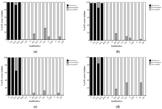 Antibiotic susceptibility of B. cereus isolated from garlic chives (a), soil (b), compost (c), and irrigation water (d) was determined by disk diffusion method. P, penicillin; OX, oxacillin; CTX, cefotaxime; FOX, cefoxitin; IPM, imipenem; CN, gentamicin; S, streptomycin; RD, rifampin; SXT, trimethoprim-sulfamethoxazole; VA, vancomycin; DA, clindamycin; E, erythromycin; LZD, linezolid; C, chloramphenicol; TE, tetracycline; CIP, ciprofloxacin.