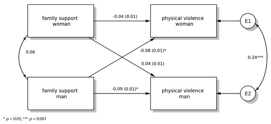 The focus of this study is the investigation of the effect of family support on the perpetration of physical violence. We used the Actor-Partner Interdependence Modeling (APIM) Cook and Kenny [30] to evaluate the impact of the independent variable, family support, as well as the covariates (romantic attachment and childhood stability), on the partner’s dependent variable on perpetrating physical violence (partner effects). The following questions are examined: