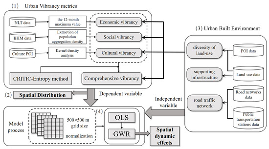 This study constructed an evaluation system for urban vibrancy (Figure 2). It includes four steps: (1) quantifying the economic vibrancy, social vibrancy, and cultural vibrancy of cities using three types of big data: NTL, BHM, and POI, and using the CRITIC-entropy method to construct a comprehensive urban vibrancy model; (2) visualizing the four types of vibrancy and comparing their spatial distributions; (3) selecting possible influence factors to construct a built environment index system; and (4) applying the OLS and GWR models to exploring the correlation between built environment factors and urban vibrancy.