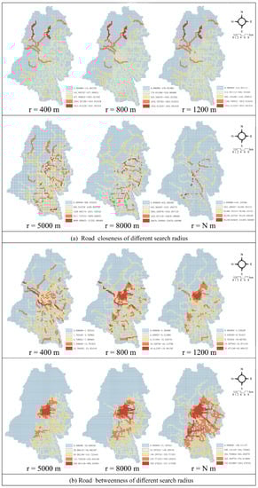 Road closeness (a) and betweenness (b) of different search radius. The search radius equal to 400 m, 800 m, 1200 m, 5000 m, 8000 m, and N m.