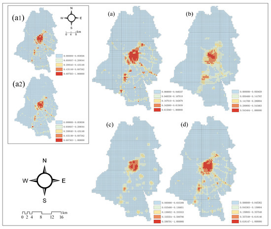 Spatial patterns of urban vibrancy in Dujiangyan. (a) Urban Social Vibrancy (USV). (a1) Urban Social Vibrancy on weekdays (USV1). (a2) Urban Social Vibrancy on weekends (USV2). (b) Urban Economic Vibrancy (UEV). (c) Urban Cultural Vibrancy (UCV). (d) Urban Comprehensive Vibrancy (UV).