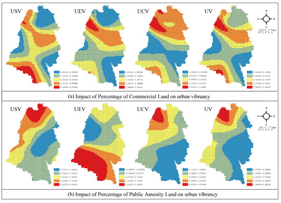 Impact of supporting infrastructure on various urban vibrancies. (a) Impact of Percentage of Commercial Land on Urban Vibrancy. (b) Impact of Percentage of Public Amenity Land on Urban Vibrancy.