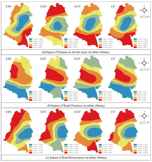 As shown by the range of coefficient changes of the independent variables in Table 3, there were noticeable spatial differences in the effects of built environment elements on the vibrancy of the four. The explanatory coefficients of each variable were further visualized and analyzed spatially to characterize the explanatory variables influenced by urban vibrancy in different regions. The results are as follows: