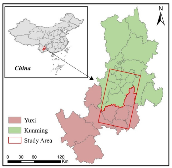 Kunming and Yuxi are the two fastest-growing cities in southwest China in recent years, with recorded urban GDP growth of more than 9.1% in the past ten years and an area increase of 272% and 348%, respectively, ahead of the Chinese average. Additionally, with the advancement of China’s “One Belt, One Road” initiative, Kunming and Yuxi have ushered in new opportunities for urban construction and development [44]. Therefore, this study takes Kunming and Yuxi as the study area (Figure 1).