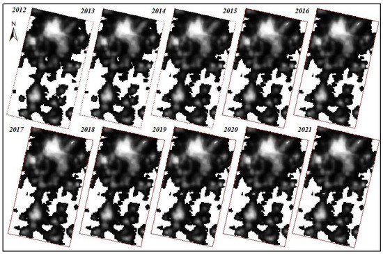 POI data and NTL data were fused by wavelet transform, and the fused images of the Kunming and Yuxi area in the last ten years are shown in Figure 5.