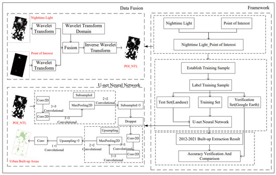 Figure 3 can be divided into three parts, including data fusion, U-net neural network, and flow chart. The steps in the data fusion are that the NTL data and POI data were respectively fused by wavelet transform in the wavelet transform domain, and then the fused figure was obtained by carrying out inverse wavelet transform. While in terms of the U-net neural network, there are a total of 23 convolution layers in the U-net neural network, including 3 pixels * 3 pixels feature extraction convolution, up-sampling 2 pixels * 2 pixels convolution, and memorizing the final mapping 1 pixel * 1 pixel convolution. As for the flow chart of the study, the first step was data sorting, including NTL data, POI data and NTL_POI data obtained through the fusion of the NTL data and POI data. The second was the specific operation process of the U-net neural network, including establishing training samples, labeling training samples, and dividing training samples into test set, training set, and verification set. The last part was the extraction of the built-up areas and the verification of the results.