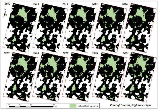 In the previous studies, the statistical data of urban built-up areas mainly originates from the data published by local governments and the data extracted by remote sensing studies. However, the data of built-up areas published by local governments are often overstated, while the accuracy of urban built-up areas extracted by remote sensing data is generally around 85% [20,58]. At present, although relevant scholars have developed many built-up area extraction systems based on NTL data and POI data, the extracted built-up areas usually only have a single time section, while the characteristics and effects of different data have not been explained in the context of a long time series [59]. Therefore, there is a general lack of scientific, objective, and unified methods to extract urban built-up areas, especially for monitoring built-up areas over a long time sequence [60]. Based on this, NTL data and POI_NTL data were used to extract the characteristics of urban built-up areas through deep learning methods in the ten years from 2012 to 2021. The results of the extracted built-up areas were analyzed by various methods. It was hoped that the characteristics and advantages of different data in extracting urban built-up areas could be obtained, and then a feasible built-up area monitoring system could be summarized to provide a feasible reference for urban planning and management.