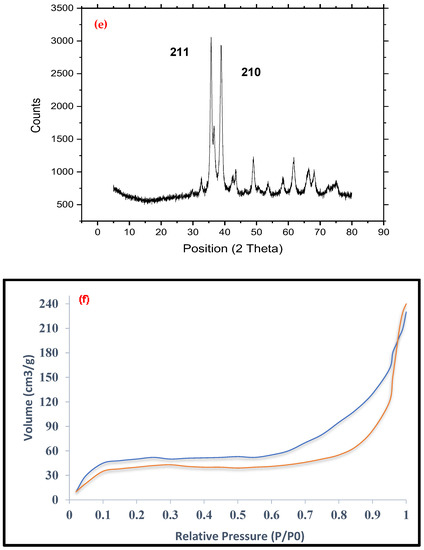 The PbO@MgZnO was formed using a co-precipitation method followed by ultrasonication for up to 1.5 h. The synthesized PbO@MgZnO is characterized by FE-SEM, TEM, EDX, XRD, and nitrogen sorption techniques. The average size of the nanoparticle measure was 22.2 nm, as illustrated in the high magnification Figure 1a. The low magnification image (Figure 1b) of SEM revealed that some particles are in unit form and some look big due to the clubbing of small nanoparticles over one another. However, during experiments, it is observed that the particle is easily dispersed in unit form when it is poured into the dye solution. TEM images (Figure 1c) confirm the morphology, size, and clubbing of small nanoparticles observed in FE-SEM images. EDX (Figure 1d) illustrates that the adsorbent is made up of oxide of Pb, Mg, and Zinc, having proper concentration without any impurities. The crystalline nature of XRD was revealed in the peaks at 35°, 38°, 43°, 50°, 52°, 57°, 61°, and 66° for PbO@MgZnO (Figure 1e). The N2 adsorption-desorption graph (Figure 1f) depicts the unrestricted mono/multilayer adsorption at the macroporous adsorbent surface and reveals the 128 m2/g of the specific surface area of PbO@MgZnO.