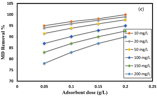 (a) MD adsorption changes with pH (PbO@MgZnO = 0.2 g, MD concentration = 50 mg/L, 90 min), (b) effect of time on the adsorption of MD dye, and (c) variation of PbO@MgZnO dose (at 25 °C).