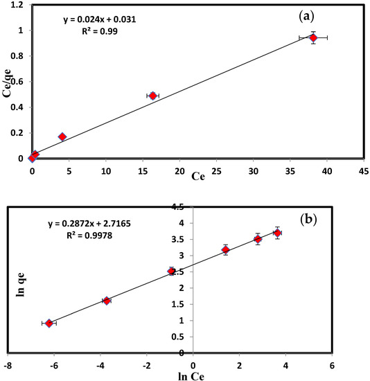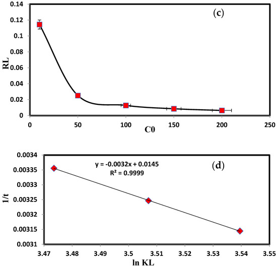 The energy of MD adsorption on PbO@MgZnO has been analyzed using models suggested by Ho and McKay [44,45,46,47]. The kinetics study affirmed that the adsorption of dye on PbO@MgZnO demonstrates the pseudo-second-order (Figure 3 and Table 1) (Equations are given in Supplement File). Using the famous Langmuir [48,49] and Freundlich [50,51] models, the adsorption of MD was analyzed (Equations are given in Supplement File). Figure 4a,b illustrate isotherms of adsorption, and the measured parameters appeared in Table 2. So, we can conclude that the above study could be a homogenous adsorption of a monolayer, and due to good agreement of the Freundlich model, double and multilayer models can also be followed by the adsorption process. The separation factor (RL) is in between 0 to 1 and supports successful adsorption (Figure 4c). The MD dye adsorbed on PbO@MgZnO as a function of the temperature of the system appeared in Figure 4d. The ΔG was determined to be −8605.89 Jmol−1. The negative ΔG refers to the spontaneity of MD adsorption on PbO@MgZnO and demonstrates that the adsorption proceeds towards stability [52,53].