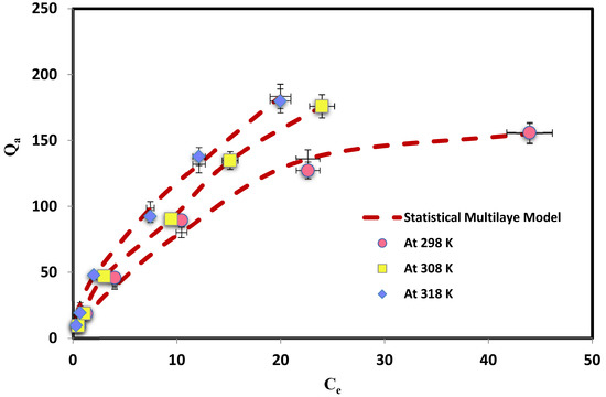 An important parameter n is the orientation of the MD molecules on the PbO@MgZnO surface (either horizontally or vertically). If n is fewer or more than one, this is likely due to the adsorption incorporation of the isolated MD molecules being horizontal or vertical. In addition, multi-docking (n < 1) or multimolecular (n > 1) can be used to adsorb MD dye on PbO@MgZnO’s (Figure 5). Consequently, an MD molecule can be adsorbed at n < 1 on the various active sites of PbO@MgZnO, although, many dye molecules can also be adsorbed at n > 1 [54,55,56]. Provided in Figure 6a and Table 3 are the values of the other model parameters, including parameter n. n = 0.395, 0.290, and 0.280, respectively, at 298, 308, and 318 K (i.e., all values were below 1). MD-to-PbO@MgZnO active-site interactions thus incorporated horizontal molecular positioning and multi-locking processes [55,56]. This finding demonstrates that single MD molécules interacted in the horizontal direction with various active PbO@MgZnO sites and adsorbed MD molecules [55,56]. In general (n < 0.5): this scenario revealed that an MD molecule may be interacting with at least two PbO@MgZnO adsorption sites. Then, the best-fitting model is used to derive Nm, Q, and parameters, as indicated in Table 3. The RMSE value of models 1 to model 3 is provided in Table 4; the R2 value for model 3 is very high, which demonstrates that model 3 is best fitted for the current adsorption mechanism.