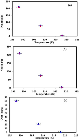 The shift in the PbO@MgZnO active site number (Nm parameter) for the adsorption temperature is illustrated in Figure 6b. For MD adsorption at 298, 308, and 318 K, see Table 3 for Nm values, which were 210, 75, and 4.5 mg/g, respectively. The Nm value decreases due to the n parameter decrease. Usually, a decline in the number of PbO@MgZnO functional positions occupied was the product of the adsorption mechanism consistent with the decline of the n parameter and, subsequently, the reduction of the Nm parameter. The reduction in the Nm values often indicates the degradation of the contribution of this adsorbent’s new active sites (PbO@MgZnO) to the phase of MD adsorption.