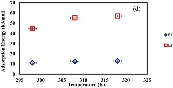 The ε1 and ε2 present interactions between molecules and the surface of the first and second layers, respectively. We found that both adsorption energies increased concerning temperature, due to the thermal motions. The adsorption energy at 298 K was 44.74 kJ/mol, and the adsorption energy at 318 K was 57.01 kJ/mol (Figure 6d). This increase in energy was explained by the influence of temperature on the surface, which excited the atoms, and which could easily record adsorbed atoms in the surface volume.