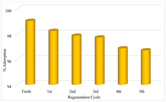 To investigate the reuse capacity of PbO@MgZnO, the adsorbed color on nanoparticles was desorbed utilizing hydrochloric acid (0.1 M), and PbO@MgZnO was repeatedly reused up to five times. PbO@MgZnO demonstrated a good % adsorption capacity even after reuse five times (Figure 7). The aforesaid study and its findings indicate that PbO@MgZnO is a suitable material for industrial wastewater treatment.