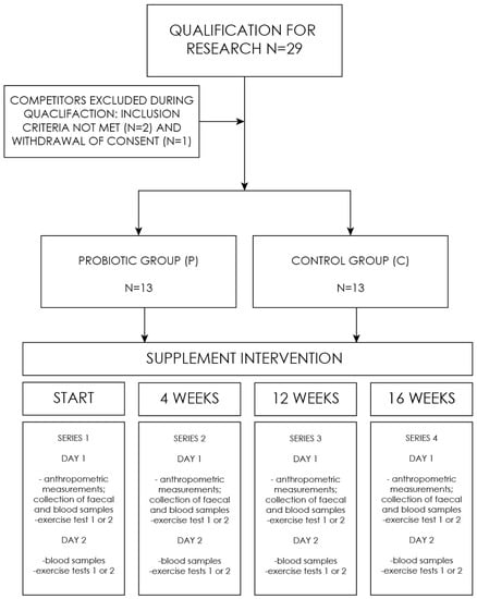 This research involved 26 road cyclists, representing clubs from the Małopolska region, who regularly and successfully participate in domestic and foreign competitions. The main criteria for inclusion in the studied group were experience in competitive cycling for at least 5 years, good health (assessed during medical qualification), male sex, age between 18–26 years, and a high sporting level (participation in national and international cycling competitions). The average training period of the athletes was over 9 years. Participants on immuno-modulatory medications were excluded. Inclusion in the study was dependent on the subjects not taking antibiotics or supplements/foods containing probiotics for at least one month prior to and during the study period. The athletes were trained by two coaches. The coaches worked closely together and planned the training regimen for this study. Training loads were the same for all cyclists. The cyclists undertook 1.48 ± 0.8 training sessions every day lasting approx. 104.28 ± 5.34 min, which accounted for about 6 training units during the week, with a total length of approx. 11 h.