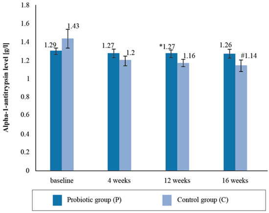 Alpha-1-antitrypsin level in the blood serum at follow-up measurements during supplementation intervention. * Statistically significant intergroup differences (p < 0.05) # Statistically significant differences compared with the initial value (p < 0.05).