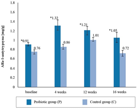 Alfa-1-antytrypsin concentration in the stool sample at follow-up measurements points during supplementation intervention. * statistically significant intergroup differences (p < 0.05).