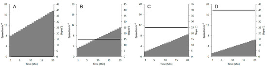 All the athletes involved in this study performed, in random order, four incremental test sessions with different constant slopes. All the sequence possibilities (24 different randomizations) were assigned to the athletes by a draw, eliminating successive sequences to avoid each athlete performing a similar sequence. The tests were completed in a period of two weeks, respecting at least three days of rest after each assessment and avoiding other strenuous activities. The protocols were designed with 0%, 15%, 25% and 40% positive slopes in ecological field conditions. The level protocol was performed on a track and field loop, whereas the slope protocols were performed on a regular track with a constant slope in a ski resort. The level protocol starts at 8 km·h−1 and increases by 0.5 km·h−1 every minute [33]; the 15% slope protocol starts at 3.37 km·h−1 and increases by 0.41 km·h−1; the 25% slope protocol starts at 2 km·h−1 and increases by 0.34 km·h−1; and the 40% protocol starts at 1.35 km·h−1 and increases by 0.27 km·h−1 (Figure 1). The uphill protocols were designed, based on previous experiments, in order to reach similar test durations whatever the slope, in line with the current recommendations [34]. These protocols start at the same ascending speed (AS) of 500 m per hour and with increments of 50 m per hour for the 15% slope condition, and of 100 m per hour for the 25% and 40% conditions. The speed control was performed using an audio soundtrack read by a mobile MP3 player. For the level condition, the pacing was done by a soundtrack reading a sound every 20 m [33]. Regarding the uphill test, the fixed pacing was done every 15 s. To maintain the right speed, the athlete must be at the flag position when the signal sounds. The test was interrupted if athletes deviated more than 5 m difference from the appropriate position during two successive intervals.