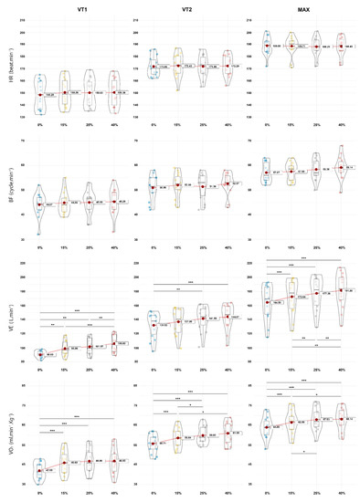 Violin plot of dependent variables, heart rate (HR), breathing frequency (BF), ventilation (), oxygen consumption () for all time points (VT1, VT2 and MAX) for slope conditions (0, 15, 25 and 40%). Statistical differences observed were noted as follow; * p < 0.05, ** p < 0.01 and *** p < 0.001.