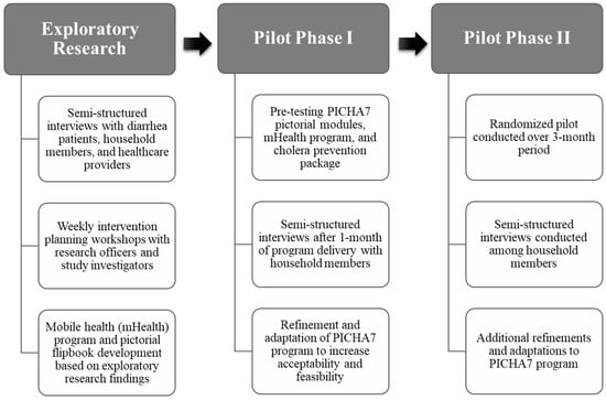 Phase I. Phase I of the pilot study focused on pre-testing the PICHA7 pictorial modules, mobile messages, and cholera prevention package to determine the initial acceptability and the feasibility of delivering these components over a 1-month period. From October to December 2020, 88 participants from 20 households participated in Phase I piloting. All of the households received the PICHA7 program. Health promoters received 1-month of hands-on training on how to deliver the intervention during the pilot study. Trained health promoters delivered the PICHA7 program during 1 health facility visit during the time of illness for the index diarrhea patient in the household. Household visits were then conducted on Day 2 and Day 5 after enrollment of the patient household. One month after program delivery, semi-structured interviews were conducted to obtain beneficiary feedback on the intervention. The findings from Phase I enabled us to make refinements and adaptations to the PICHA7 program, guided by IBM-WASH, in preparation for a larger and longer 3-month evaluation of the intervention in Phase II. Semi-structured interviews were conducted with a purposive sample of 20 diarrhea patient household members.