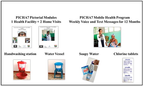 PICHA7 program intervention development targeted the IBM-WASH habitual, individual, household, community, and structural/societal levels at multiple dimensions to ensure that facilitators and barriers of the target WASH behaviors were thoroughly addressed. Intervention development was initially based on exploratory interviews, and further refinements were made based on pilot study findings. The PICHA7 health facility and household pictorial modules and mobile messages were developed during weekly intervention planning workshops over a 14-month period. The workshops included research officers and study investigators. Each workshop was 2–6 hours in length. During initial intervention planning workshops, the key themes that emerged during the exploratory research were discussed and pictorial module content was then developed to target the facilitators and barriers of the behavioral recommendations identified. The mHealth component of the PICHA7 program was developed during intervention planning workshops after the development of initial pictorial modules. mHealth content was developed to align closely with the pictorial modules to target facilitators and barriers to the promoted WASH behaviors identified during exploratory research, also using the IBM-WASH framework. There were three types of mobile messages: interactive voice response (IVR) quizzes, voice calls, and SMS messages. The EngageSpark platform (https://www.engagespark.com/ (accessed on 4 January 2021)) was used to deliver voice, IVR quizzes, and SMS messages for the PICHA7 mHealth program. An mHealth expert from EngageSpark participated in one intervention planning workshop to train the team on how to send mobile messages using this platform.