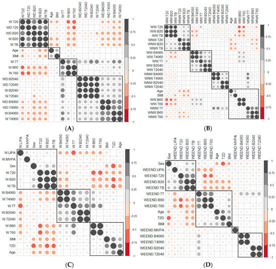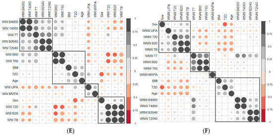 Correlation between the variables of the SB according to (A) Weekdays and at weekends, (B) Weekday working time and weekday non−working time, (C) Weekday total time, (D) Weekend, (E) Weekday working time and (F) Weekday non−working time. The gray and black circles indicate a positive correlation between variables, while the red circles indicate a negative correlation. When circles sizes is larger, then correlation between variables is greater. The groups of variables correlated with each other are marked with squares. T2D, diabetes type 2; BMI, body mass index; W.B20, weekday sedentary breaks <20 min (number/day); W−B2040, weekday sedentary breaks of 20−40 min (number/day); W−B4060, weekday sedentary breaks of 40−60 min (number/day); W.B60, weekday sedentary breaks >60 min (number/day); W.T20, weekday time spent in sedentary bouts <20 min (minutes/day); W.T2040, weekday time spent in sedentary bouts 20−40 min (minutes/day); W.T4060, weekday time spent in sedentary bouts 40−60 min (minutes/day); W.T60, weekday time spent in sedentary bouts >60 min (minutes/day); W.TB, weekday total sedentary breaks (number/day); W.TT, weekday total sedentary time (minutes/day) weekday; WD.B20, weekend sedentary breaks <20 min (number/day); WD.B2040, weekend sedentary breaks of 20−40 min (number/day); WD.B4060, weekend sedentary breaks of 40−60 min (number/day); WD.T20, weekend time spent in sedentary bouts <20 min (minutes/day); WD.T2040, weekend time spent in sedentary bouts of 20−40 min (minutes/day); WD.T4060, weekend time spent in sedentary bouts of 40−60 min (minutes/day); WW.B20, sedentary breaks <20 min during working hours (number/day); WW.B2040, sedentary breaks of 20−40 min during working hours (number/day); WW.B4060, sedentary breaks of 40−60 min during working hours (number/day); WW.B60, sedentary breaks >60 min during working hours (number/day); WW.T20, time spent in sedentary bouts <20 min during working hours (minutes/day); WW.T2040, time spent in sedentary bouts of 20−40 min during working hours (minutes/day); WW.T4060, time spent in sedentary bouts of 40−60 min during working hours (minutes/day); WW.T60, time spent in sedentary bouts >60 min during working hours (minutes/day); WW.TB, total sedentary breaks (number/day); WW.TT, total sedentary time (minutes/day) during working hours; WNW.LIPA, light−intensity physical activity during non-working hours (minutes/day); WNW.B20, sedentary breaks <20 min during non−working hours (number/day); WNW.B2040, sedentary breaks of 20−40 min during non−working hours (number/day); WNW.B4060, sedentary breaks of 40−60 min during non−working hours (number/day); WNW.B60, sedentary breaks >60 min during non−working hours (number/day); WNW.T20, time spent in sedentary bouts <20 min during non−working hours (minutes/day); WNW.T2040, time spent in sedentary bouts of 20−40 min during non−working hours (minutes/day); WNW.T4060, time spent in sedentary bouts of 40−60 min during non−working hours (minutes/day); WNW.T60, time spent in sedentary bouts >60 min during non−working hours (minutes/day); WNW.TB, total sedentary breaks during non−working hours (minutes/day); WNW.TT, total sedentary time (minutes/day) during non−working hours; WEEND.LIPA, weekend light−intensity physical activity (minutes/day); WEEND.B20, weekend sedentary breaks <20 min (number/day); WEEND.B2040, weekend sedentary breaks of 20−40 min (number/day); WEEND.B4060, weekend sedentary breaks of 40−60 min (number/day); WEEND.T20, weekend time spent in sedentary bouts <20 min (minutes/day); WEEND.T2040, weekend time spent in sedentary bouts of 20−40 min (minutes/day); WEEND.T4060, weekend time spent in sedentary bouts of 40−60 min (minutes/day); WEEND.TB, weekend total sedentary breaks (number/day).