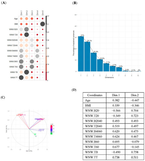 PCA results for the case of variables related to the SB pattern on weekdays and non−working hours: (A) correlation between the new components and original variables. The dimensions are the new components or variables results for PCA; (B) percentage of the original variability, explained by each of the new components; (C) Grouping of original variables, positive or negative contribution of the variables to the formation of the components; (D) Coordinates of the two new components for the case of variables related to weekday SB in non−working hours, the contribution of the original variables to the resulting components is described. BMI, body mass index; WNW.B20, sedentary breaks <20 min during non-working hours (number/day); WNW.B2040, sedentary breaks of 20−40 min during non−working hours (number/day); WNW.B4060, sedentary breaks of 40−60 min during non−working hours (number/day); WNW.B60, sedentary breaks >60 min during non-working hours (number/day); WNW.T20, time spent in sedentary bouts <20 min during non−working hours (minutes/day); WNW.T2040, time spent in sedentary bouts of 20−40 min during non-working hours (minutes/day); WNW.T4060, time spent in sedentary bouts of 40−60 min during non-working hours (minutes/day); WNW.T60, time spent in sedentary bouts >60 min during non−working hours (minutes/day); WNW.TB, total sedentary breaks during non−working hours (minutes/day); WNW.TT, total sedentary time (minutes/day) during non−working hours.