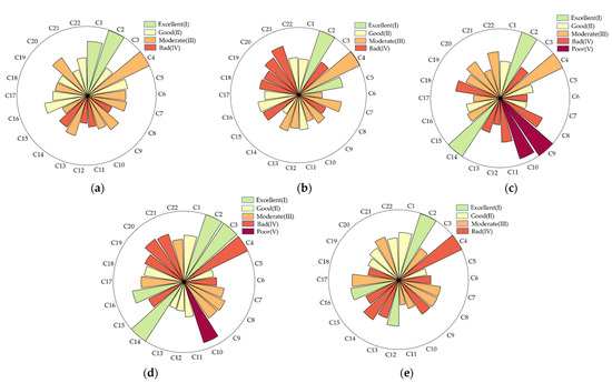 Indicator layer evaluation results. The results were obtained according to the principle of maximum affiliation. The size of the affiliation of each indicator with the rank is depicted in the figure. The maximum affiliation degree is 1. (a) Jinan section; (b) Binzhou section; (c) Zibo section; (d) Dongying section; (e) Weifang section.
