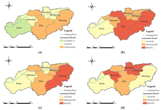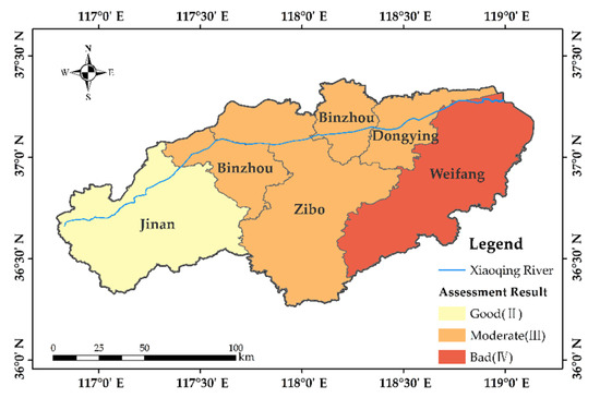 The results of the criterion layer in the study area are shown in Figure 3. The results of the upstream river sections were excellent, and the environmental function of the main stream of the Xiaoqing River was generally satisfactory. Overall, the river’s environmental function gradually declined from upstream to downstream, while the Zibo section’s evaluation level in the intermediate reaches was only moderate. Only the upstream part of the Jinan section was rated as having good ecological function, and evaluation results for the Zibo and Weifang sections were bad. The ecological function status of the main stream of the Xiaoqing River was unsatisfactory, which is consistent with its spatial fluctuation characteristics and environmental functions. The Jinan and Zibo sections, which are upstream, had better evaluation results in terms of social function, while Weifang, which is downstream, had worse evaluation results. The economic function was spatially heterogeneous. Better evaluation results were obtained from the river’s upstream and downstream sections. The Jinan and Weifang sections produced excellent results, and the Zibo section produced medium results, while the Binzhou and Dongying sections produced bad results.