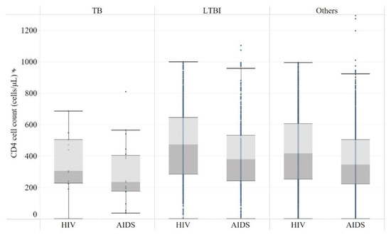 The median (IQR) CD4 cell counts of TB, LTBI, and HIV mono-infection were 241 (183–458), 425 (268–606) and 387 (236–568), respectively. The CD4 cell count of HIV cases was higher than that of AIDS cases in both groups of LTBI (p < 0.0001) and HIV mono-infection (p < 0.0001), while there was no difference in the TB/HIV coinfection group (p = 0.6077) (Figure 3 and Appendix A Table A2).