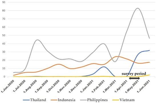 Evaluation of the differences among the countries suggests that the infection status affected the social and psychological factors motivating or demotivating people from receiving the vaccination. The number of infections and the rate of increase were high in the Philippines, whereas the number of infections was stably high with a low rate of increase in Indonesia. Alternatively, the number of infections was low in both Thailand and Vietnam, although the rate of increase was high in Thailand but low in Vietnam (Figure 1). In the Philippines, where both the number of infections and the rate of increase were very high compared to other countries, willingness to be vaccinated tended to be high. In the Philippines, people perceived that the risk of COVID-19 was more serious compared to the other countries, and doubts about the efficacy and safety of the vaccine did not demotivate vaccination. Some unwilling people who strongly doubt the efficacy and safety of the vaccination remained but were likely motivated by external factors such as demands from employers and cost-free vaccination.