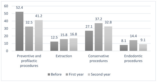 Figure 1 shows the percentages of dental procedures before and during the first and second years of the COVID-19 pandemic. The preventive and prophylactic measures in the year before the pandemic amounted to 1444 (52.4%) cases, but in the first and second years, we can see a drop provision of these procedures, with 538 (32.5%) and 1066 (41.2%) cases, respectively. In the first year of the pandemic, the most common procedure was restorative treatment, with 614 (37.2%) cases. The least common procedure in all years was endodontic treatment, with 222 (8.1%), 238 (14.4%), and 236 (9.1%) cases, respectively.