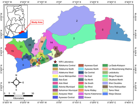 Map of Greater Accra region, Ghana, showing sample source locations and number of drinking water samples received and tested, December 2021–March 2022. WRI: CSIR–Water research Institute laboratory in Accra. Numbers indicate the number of samples received from each district.