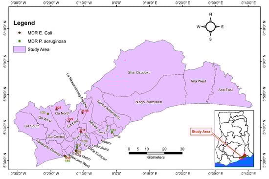 A spot map of Greater Accra region, Ghana showing source locations of MDR E. coli and P. aeruginosa isolates from water samples (December 2021–March 2022). MDR: Multidrug resistance.