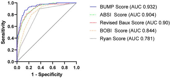 In this study, we applied five of the most commonly utilized burn injury scoring models and evaluated their accuracy to predict in-hospital mortality. Our results suggest that the recently introduced BUMP score fitted the data retrieved from our burn unit and that it delivered excellent discrimination properties compared to the pre-existing prognostic models given the AUC value of 0.93. Despite a lower AUC value when compared to the BUMP score, our results similarly support the prognostic ability of the ABSI score to estimate mortality in our unit with superior prognostic value, when compared to previously published AUC values [14,15,16].