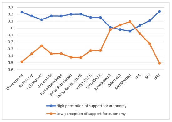 Support for autonomy created a positive relationship with motivation, as shown in the studies by Amorose and Anderson-Butcher [11], Gillet et al. [10] and Pelletier et al. [14]. It should even be noted that in the study by Ramis, Torregrosa, Viladrich and Cruz, [48], support for autonomy negatively predicted amotivation, coinciding with our study of athletes who received high support for perceived autonomy and had higher scores in the variables of self-determined motivation.