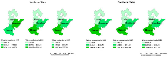The distribution of wheat production (10,000 tons) in Hebei, Henan, and Shandong Provinces.