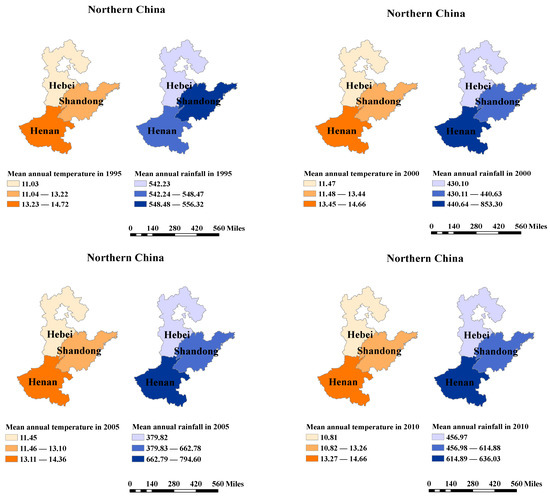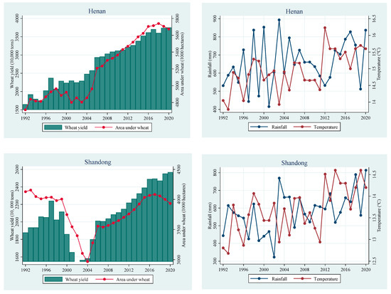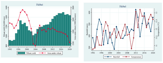 In the case of Hebei Province, the climate variables (i.e., temperature and rainfall) have a positive, significant impact on wheat production. This means the climate conditions are more favorable for wheat cultivation in Hebei Province. Specific to the North China Plain, where this study area is located, some research evidence shows that in the north of this plain, the impact of rainfall on wheat production is positive, while in the south of this plain, the impact of rainfall turns negative [49]. Similarly, for temperature, the increase in temperature increases the winter wheat yield in the northern part of the North China Plain but decreases the wheat yield produced in winter in the south of the North China Plain [50]. The top three wheat-producing provinces are selected for this investigation. Hebei, Shandong, and Henan Provinces are distributed in the North China Plain. The three provinces’ yearly mean temperature and yearly mean precipitation are ranked from low to high in Hebei, Shandong, and Henan (see Figure 2). The temperature and rainfall in Hebei Province are low, and the impacts of temperature and precipitation on wheat yield are positive.