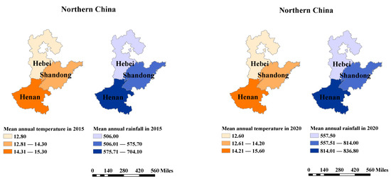 Wheat is China’s second most important food crop, after rice, and its planting area accounts for 22~30% of the total cultivated land [30]. Winter wheat is the predominant crop in China, accounting for more than 90 percent of the total output [31]. The regions of China that produce winter wheat can be divided into Southern and Northern cultivation areas. The northern winter wheat producing region is the most concentrated wheat growing and consuming region in China, and its sown area and wheat output account for around two-thirds of the country. In recent years, the top three provinces in northern China for winter wheat production were Henan, Shandong, and Hebei. Henan Province has an alternating temperate monsoon and subtropical climate, whereas Shandong and Hebei Provinces have a temperate monsoon climate. Figure 1 and Figure 2 show their geographical location, wheat yield, temperature, and rainfall.