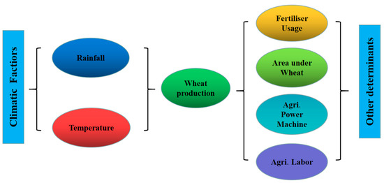 Previous studies in various parts of the world have extensively documented the impact of changing climate on wheat crop yield. Most existing research on China discussed the relationship between the two at the national and regional levels [31,32,33] or only focused on a specific province, such as Henan Province, which has the highest wheat yield [30,34]. However, climate change causes food production variability in regions with varying climate resources. The current paper assesses the long-term effects of changing climate on wheat production in the top three provinces in northern China to further analyze the heterogeneous influence of changing climate on wheat production, propose targeted measures to deal with climate change for the main grain-producing areas in China, and contribute to China’s food security strategy. Figure 3 shows the dynamic nexus between climatic factors, other determinants, and wheat production.