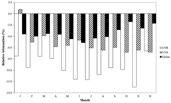 The % relative attenuation in the case of UVB irradiation varies between a maximum in August of −11.68% and a minimum in December of −6.56%, whereas the corresponding values for UVA irradiation are −6.84% in December and +0.77% in January. It should be noted that with the exception of January, all other values for the relative attenuation of UVA irradiation are negative: in the range between −6.84% in December and −3.94% in March.