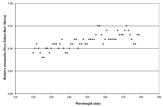 Relative UVA irradiation attenuation within its spectral range: (Neve Zohar:Beer Sheva).