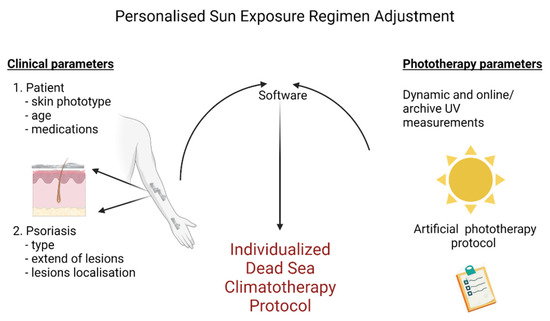 Some will say that Dead Sea Photoclimatotherapy is an example of personalized medicine. Indeed, sun exposure times can vary during the same day and for the same disease depending on the patient’s clinical parameters. However, even if individual parameters and measurements of irradiance at the Dead Sea are the basis of our recommendations (cf., Figure 5), we believe that we are still far from the current definition of personalized medicine. In fact, we are only giving an adequate dosage of ultraviolet irradiation as we would for antibiotic treatments. According to published definitions [19], precision medicine prescribes much more. Personalized medicine improves patient care by using biological and molecular information from diseases, genetic and proteomics as well as metabolomics. Actually, our research center pursues this goal mainly through the study of the skin microbiome [20] and an improved understanding of the disease’s symptoms [21].