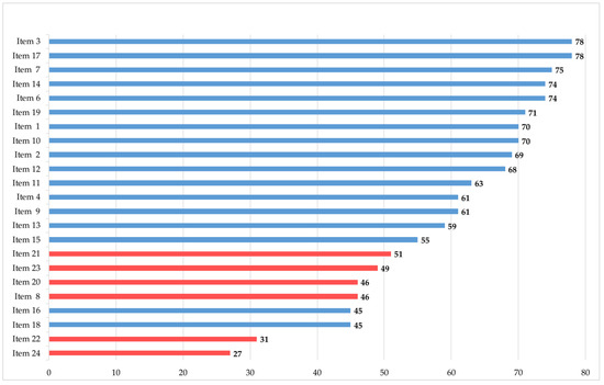 The structured questionnaire, which is based on preliminary work by the working group [14,17] and was developed in interdisciplinary and multi-professional discussions in the Interdisciplinary Center for Palliative Care Medicine, is written in German and can be found in the Supplementary Materials (translated into English, Questionnaire). In total, the questionnaire comprised 42 statements or questions covering three areas: an outcome-based evaluation, a global evaluation and demographic data. Part 1 contained 24 statements focused on knowledge and attitude (Table 1) based on the ten core competencies defined by the European Association of Palliative Care in 2013 [10]. Part 2 consisted of 14 statements that judged the feasibility of the e-learning tool, ranking items such as structure, efficiency, effectiveness, comprehensiveness, and satisfaction. Finally, four questions covered demographic data, asking for age, gender, work experience, and experience in intensive care medicine. The global outcome evaluation on feasibility utilized a 5-point Likert scale (from fully agree to strongly disagree), where “fully agree” and “strongly agree” were considered agreement. For the specific outcome evaluation, the German school grading system (1 = “excellent” to 6 = “unsatisfactory”) was used as a rating scale. The survey was to be conducted after completion of the e-learning, whereby the specific outcome evaluation was conducted retrospectively in a post-then method. Anonymized data collection was performed by using the online survey platform Unipark [18].