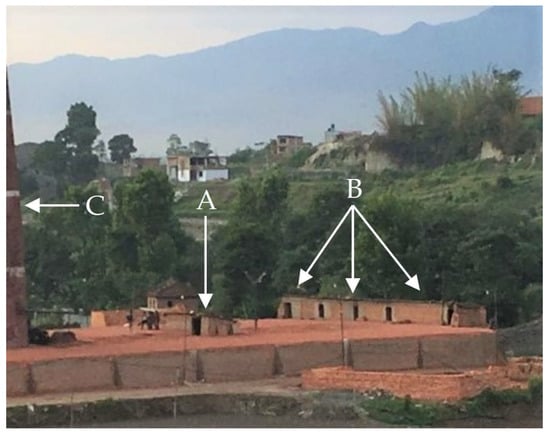 (A) Home of fire master on the brick kiln (for fixed chimney Bull’s trench brick kilns), (B) homes of brick workers adjacent to the brick kiln, and (C) brick kiln chimney in Bhaktapur, Kathmandu Valley, Nepal, May 2018.
