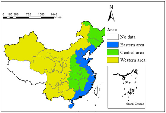 The carbon emission level of production energy consumption varies widely among different regions, and this paper divided China into three study regions: the eastern region, including Beijing, Tianjin, Hebei, Liaoning, Shanghai, Jiangsu, Zhejiang, Fujian, Shandong, Guangdong, and Hainan; the central region, including Shanxi, Jilin, Heilongjiang, Anhui, Jiangxi, Henan, Hubei, and Hunan; the western region, including Inner Mongolia, Guangxi, Chongqing, Sichuan, Guizhou, Yunnan, Shaanxi, Gansu, Qinghai, Ningxia, Xinjiang. The study area is shown in Figure 1.