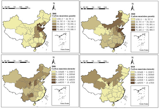 The results of calculating carbon emissions of urban production energy consumption in inter-provincial in China from 2005 to 2019 showed that carbon emission levels have obvious spatial distribution characteristics (Figure 2). Carbon emission quantity showed the regional characteristics of eastern region > central region > western region in 2005, while carbon emission intensity was opposite to the distribution of carbon emission quantity, and the western region showed more obvious differences to other regions, and its carbon emission intensity was much higher than that of other regions. By 2019, the spatial distribution of carbon emission quantity and carbon emission intensity had changed to a certain extent. The carbon emission quantity still followed the regional characteristics of eastern region > central region > western region, while the regional characteristics of carbon emission intensity of western region > central region > eastern region were more obvious than in 2005. The change in pattern of carbon emission levels from 2005 to 2019 showed the change of urban production energy consumption, the rough development mode leading to a continuous rise in total energy consumption, which, in turn, led to the rise of carbon emission quantity, but the annual growth rate of carbon emission quantity from 2005 to 2019 showed a decreasing trend. The carbon emission intensity from 2005 to 2019 also had an obvious decreasing trend. The inter-provincial average carbon emission intensity decreased from 3.7673 to 1.5340, a decrease of 59.28%, while the regional carbon emission intensity declined, showing the regional characteristics of central region > eastern region > western region. The latter was mainly due to the fact that the carbon emission intensity of the central region was higher than that of the eastern region in 2005, and the economic development of the central region accelerated from 2005 to 2019, causing the carbon emission intensity to approach the eastern region. The economic development of the western region was relatively slow, and although the carbon emission intensity also declined significantly, the decline was still smaller than that of the eastern and central regions. The western region had a high resistance to industrial structure upgrading, and its scientific and technological level was relatively backward. The higher energy consumption per unit GDP, and economic development lagged behind the eastern and central regions, thus, leading to relatively higher carbon emission intensity. So, compared with 2005, the carbon emission intensity of the eastern and central regions were closer in 2019, and the gap between the western region and the other two regions was more obvious.