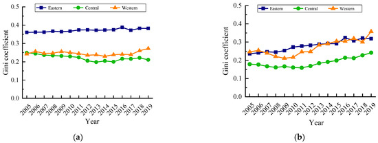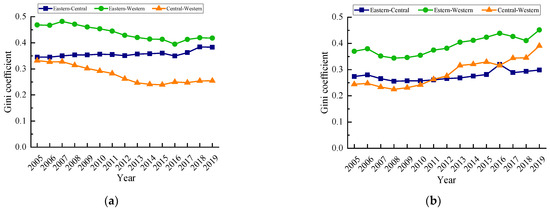The inter-regional differences in carbon emissions and their evolution trends are shown in Figure 4a. During the research period, the inter-regional differences of carbon emission quantity in the eastern–western and central–western were very similar. The inter-regional difference of the eastern–western gradually decreased after reaching its maximum value in 2007. The inter-regional difference of the eastern–central continued to increase, and the inter-regional differences of the eastern–central and eastern–western were similar in 2019. The inter-regional difference of the central–western was close to the eastern–central in 2005 and continued to decrease later, and was much smaller than the eastern–central. As shown in Figure 4b, the inter-regional difference in carbon emission intensity had an obvious upward trend, in which the inter-regional difference of the eastern–western was the largest. In 2019 the inter-regional difference of the eastern–western carbon emission intensity reached 0.4514, up 22.08% from 2005, followed by the difference of the central–western, and the difference of the central–western carbon emission intensity rose the most, at 59.96%. The inter-regional difference reached its maximum in 2019. The variation trend of the inter-regional difference of the eastern–central was relatively stable, with a small increase in the study period, and the inter-regional Gini coefficient of eastern–central only increased sharply in 2016, and then decreased and maintained a slow growth.