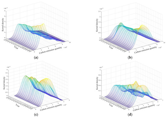 Kernel density estimation of national and regional carbon emission quantity from 2005 to 2019. (a) National. (b) Eastern region. (c) Central region. (d) Western region.