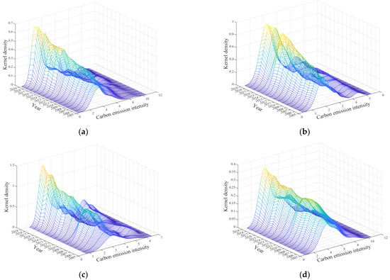 Kernel density estimation of national and regional carbon emission intensity from 2005 to 2019. (a) National. (b) Eastern region. (c) Central region. (d) Western region.